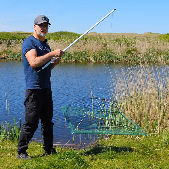 Das Netz wird an einer festen Schnur im ufernahen Bereich uns Wasser gelassen. Man kann dazu einen Stiel oder stabile Meeresrute benutzen.